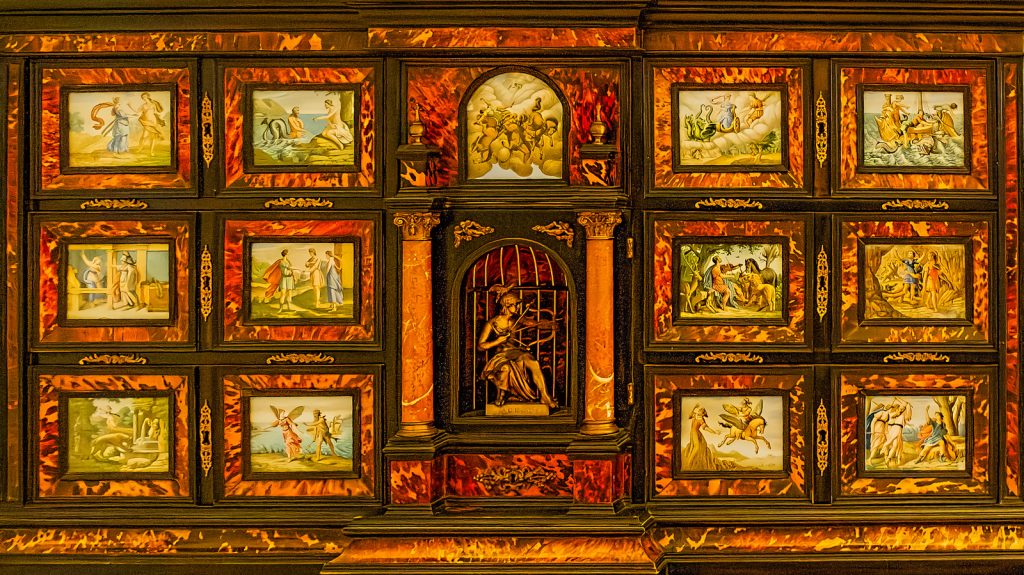 Tiene numerosos paneles cuadrados y rectangulares que rodean una sección central. Cada panel parece contener una pequeña pintura o un relieve, posiblemente representando escenas mitológicas, bíblicas o alegóricas. Estos paneles están enmarcados individualmente, lo que añade a la sensación de opulencia y detalle.